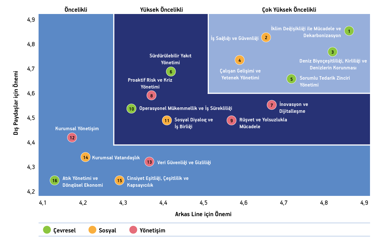 Önceliklendirme analizimiz kapsamında oluşturulan önemlilik matrisi, çevresel, sosyal ve yönetişim (ÇSY) konularını hem Arkas Line hem de dış paydaşlar açısından önem derecelerine göre sınıflandırmaktadır. Matris, 16 sürdürülebilirlik konusunu “Çok Yüksek Öncelikli”, “Yüksek Öncelikli” ve “Öncelikli” olarak gruplandırarak stratejik odak alanlarımızı belirlememize yardımcı olmaktadır.